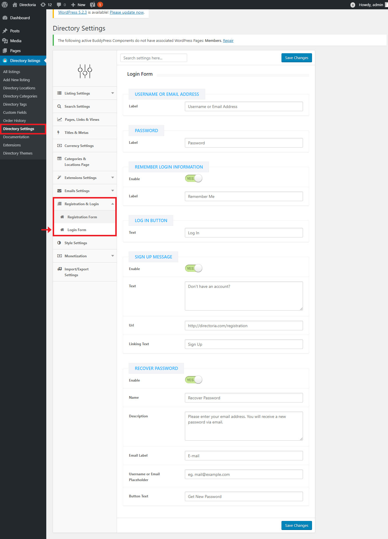 Settings Path: Directory Settings→ Registration & Login In this settings area, you can customize the registration & login form as you want. Here you can change the label or placeholder text of input fields, enable or disable any input field, etc. Based on form type we split this settings area into two subsections(“Registration Form” & “Login Form”) to make forms customization easier.